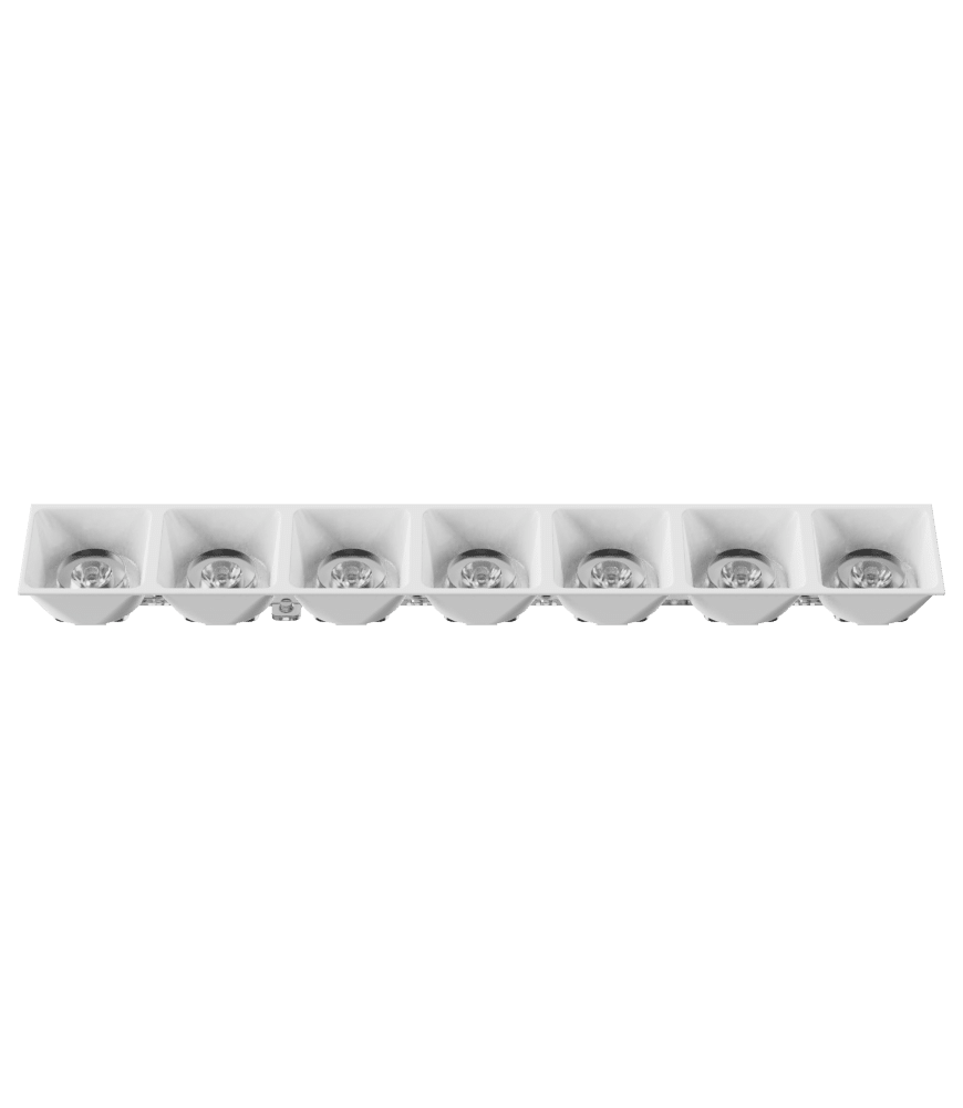 K2POLLUX7X1G101 consists of POLLUX7X1G lens and LVR2POLLUX7X101 white tall louvre (H = 20.25 mm) with glossy finishing. This product is ideal for applications requiring low UGR and discreet installation such as: Museums, Restaurants, Art Galleries and show rooms where narrow beam without stray light is required.