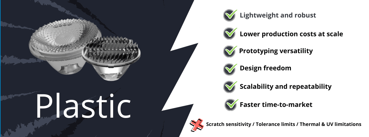 With advanced manufacturing techniques like diamond turning, high-precision injection molding, and rapid prototyping, plastics are no longer a compromise, they are a competitive edge. They enable faster development cycles, lower production costs, and more innovative geometries, such as aspheric and freeform surfaces, all while supporting high-volume scalability.